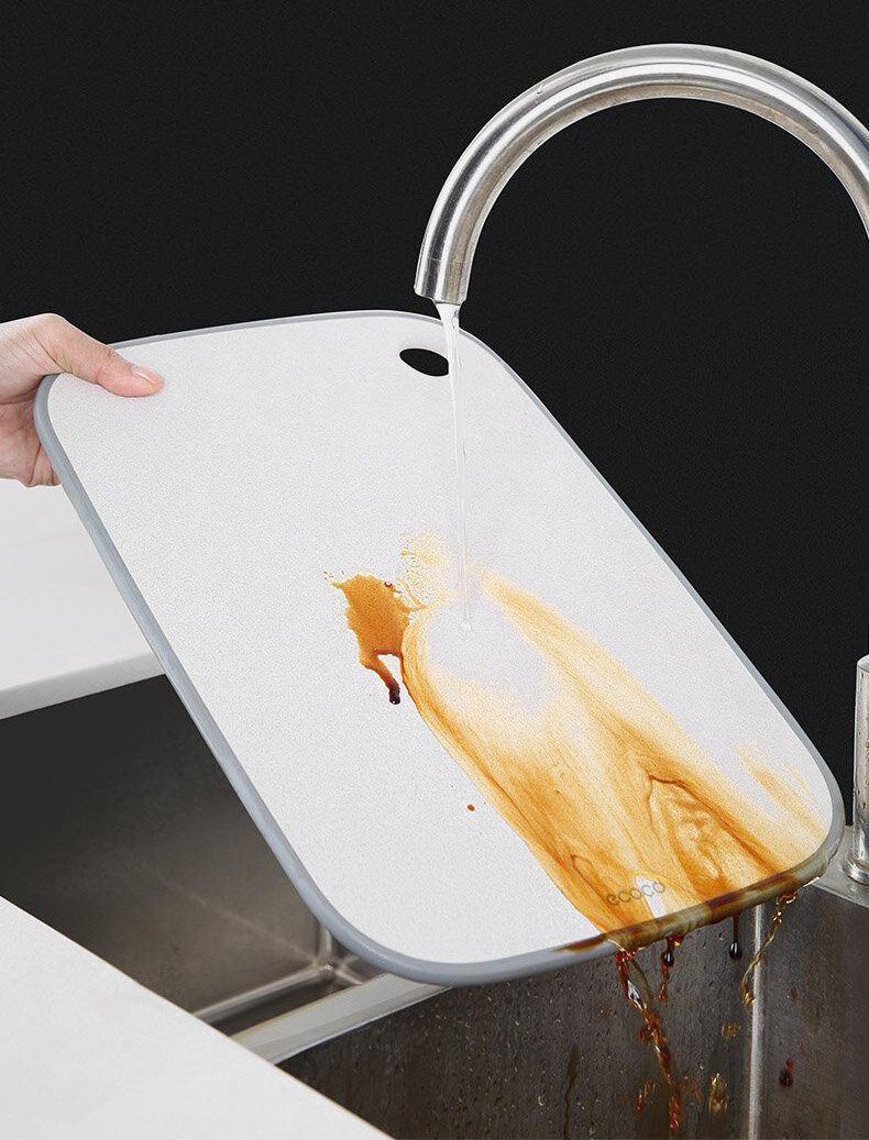 Обробна дошка ECOCO має гумовий антиковзкий кант (термопластична гума), який також утримує продукти та рідину на дошці (не дає їй витікати). Покриття дошки антибактеріальне, міцне, але не тупить ножі.