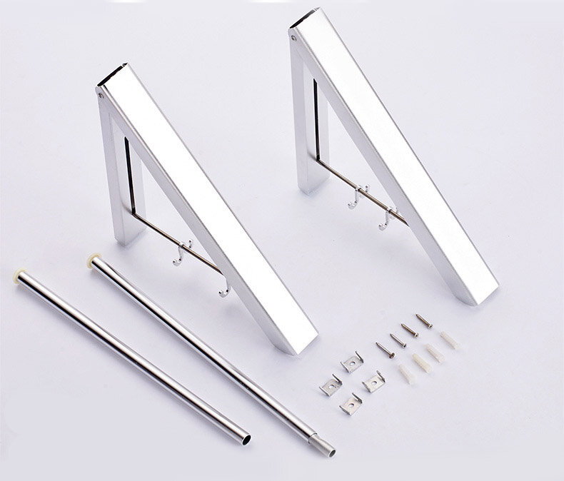 Складна вішалка на стіну з алюмінію. Займає мало місця, у складеному вигляді не помітна. Легко та швидко розкладається, витримує до 30 кг навантаження.